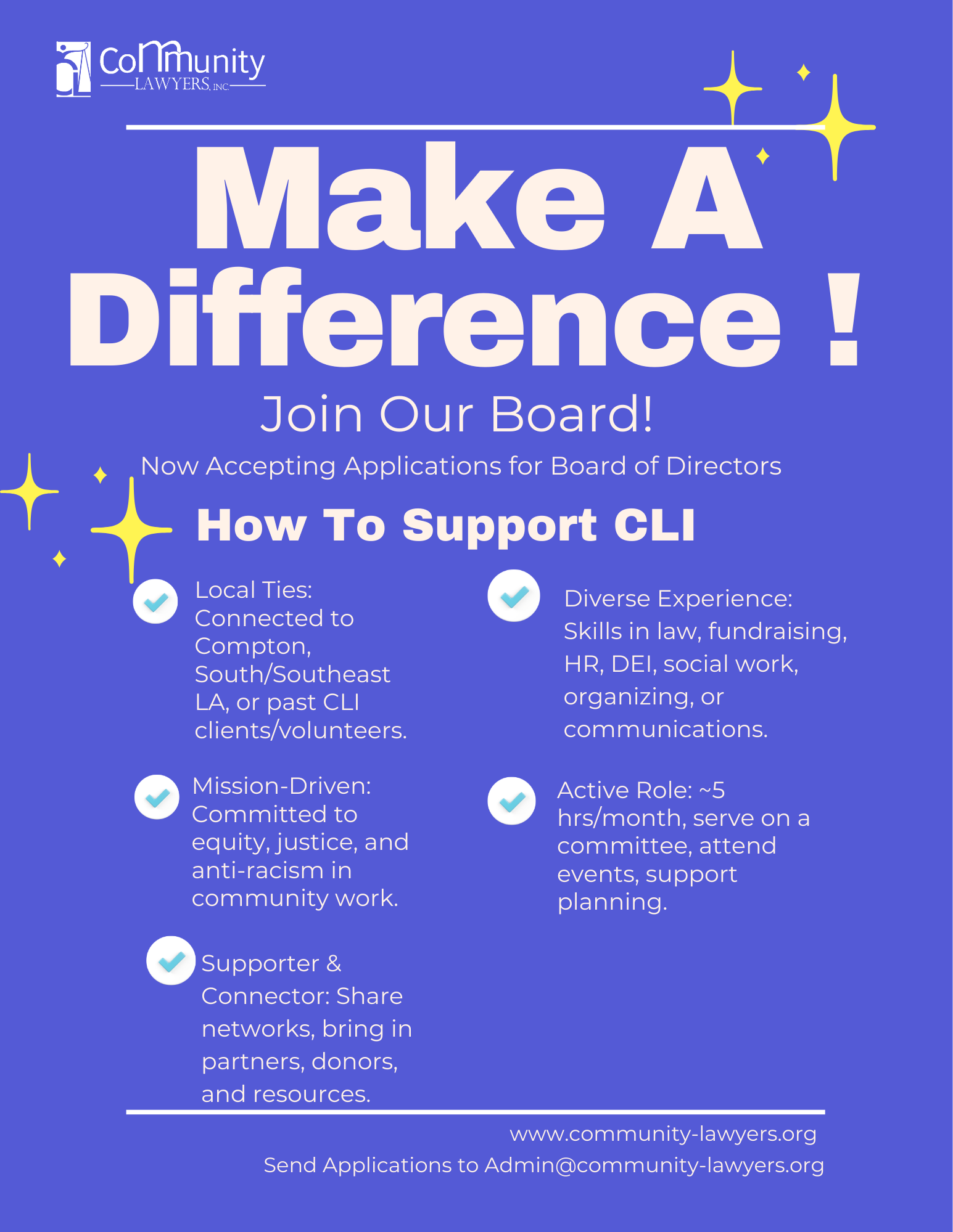 Community Lawyers, Inc. is actively looking for new board members to join our team. We are looking for people who are connected to Compton and/or the Southeast Los Angeles communities. We are particularly interested in people who have experience in the following areas: grant writing, finances, grassroots organizing, community development, event planning, education, youth development, and civic engagement. Former consumers and former volunteers, including paralegal interns, law students, and undergraduate students, are strongly encouraged to apply!! If you have any questions, please feel free to reach out to our Board President Walter Quinteros.